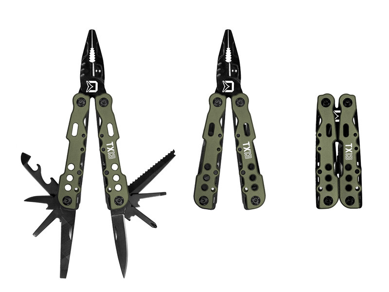 Delphin TaktyX 13 sont fabriquées en acier inoxydable. Comme leur nom l'indique, ils ont 13 fonctions différentes. À part des pinces classiques, elles ont un couteau, petite scie, ouvre-bouteille et ouvre-boîte, lime, ciseaux pour le fil, perforeuse et 4 tournevis différents. Lors de dépliage, chaque de ces instruments est automatiquement sécurisé par un système fiable.
