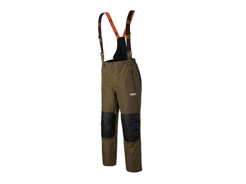 Un avantage de ce pantalon est une partie haute élevée pour protéger vos reins. Le matériel est renforcé au niveau des genoux et du fessier et les renforts noirs créent un design unique avec des bretelles et des logos Delphin.