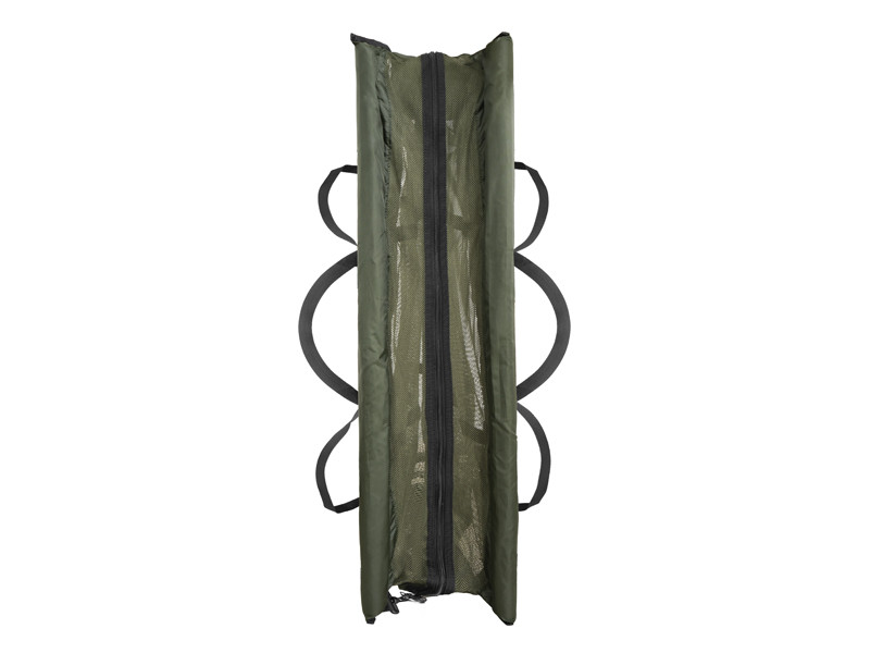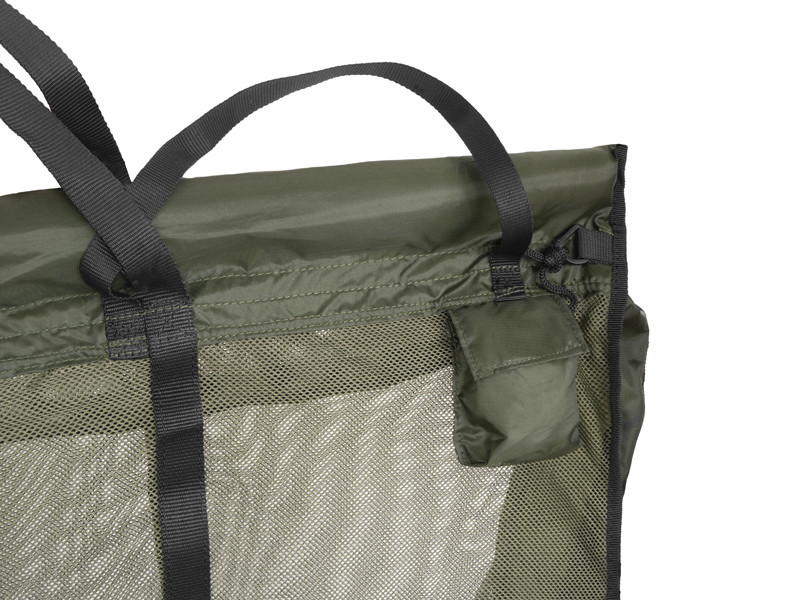 Le filet est renforcé par deux sangles noires qui servent pour l'accrocher sur le peson. De plus, le sac a des poignées en textile pour meilleur transport. Une fermeture sur les côtés et en haut facilitent la manipulation avec le poisson.