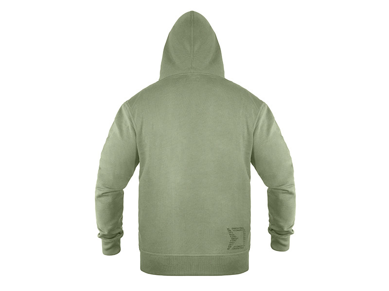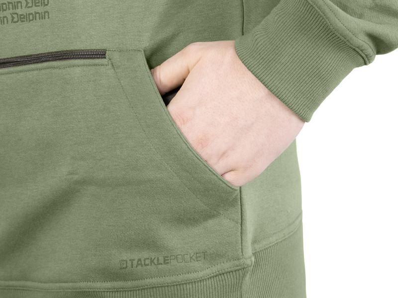Il a une grande capuche avec des cordons de serrage pour l'ajuster. Les manchettes ont un élastique pour tenir mieux autour des poignets. De plus, le sweat a une grande poche TACKLE POCKET avec un zip double qui sert à déposer vos accessoires ou d'autres choses dont vous avez besoin, comme votre téléphone portable pour le portefeuille. Quand il fait froid, vous pouvez réchauffer vos mains dans une grande poche qui se trouve dans une couche au-dessous. La partie basse est élastique pour mieux adhérer à votre corps et pour ne pas perdre de la chaleur.
