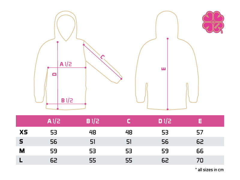 Il a aussi une grande poche avec un zip double haut de gamme. De plus, il y a une autre poche pour vos mains quand il fait froid. La capuche est rose à l'extérieur et noire à l'intérieur avec des logos Delphin et des trèfles à quatre feuilles. Elle a un cordon noir pour l'ajuster d'après vos besoins. Les manches et la taille noires sont serrées.
