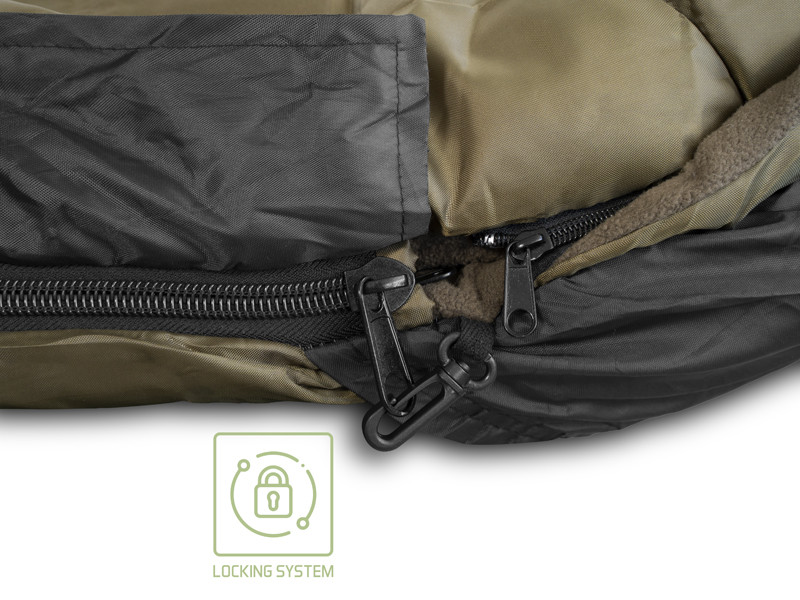 Toutes les couches internes sont en laine polaire brun agréable au toucher et très chaude pour que vous soyez confortable. Le zip principal sur les deux côtés est large et durable, il ne se coince pas et il suffit de tirer un peu la couche supérieure pour quitter le sac. Le zip de l'autre côté peut être fixé à l'aide d'une agrafe plastique. Il y a d'autres petits zips entre chaque couche pour utiliser le sac de couchage d'après les conditions climatiques. Tous les zips sont couverts par un tissu imperméable. La partie supérieure est munie d'une poche pour un oreiller.