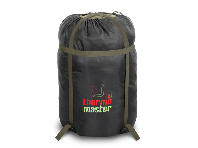 ThermoMASTER a un design khaki et noir avec des éléments rouges et verts. Il est livré dans un sac de compression avec des sangles noires et un cordon de serrage.