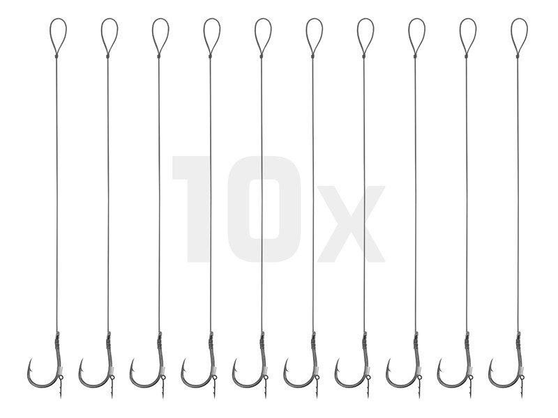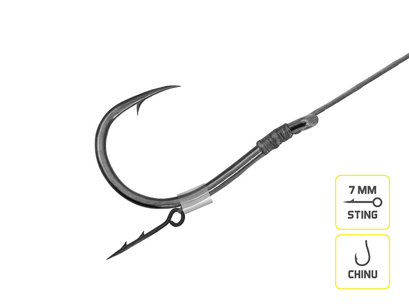Il contient une tresse très discrète sous l'eau, qui n'effarouche pas les poissons. Pour bien pénétrer la bouche du poisson, nous avons choisi les hameçons Turner et Chinu. Leur forme spécifique et leur tranchant exceptionnel garantissent une prise sûre et minimisent le risque de perdre le poisson pendant le combat.