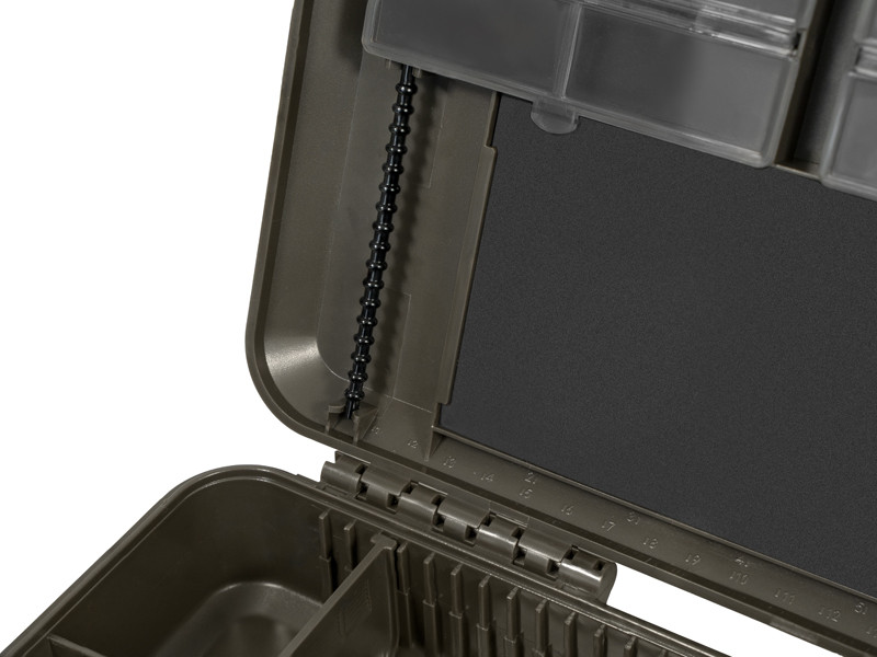 La partie basse est divisée en deux sections. La première section offre l'espace pour vos aiguilles, ciseaux ou d'autres accessoires. Vous pouvez y ranger une boîte KlikBOX Rig qui est disponible séparément. La deuxième section est divisée par des cloisons ajustables pour la modifier d'après vos besoins.