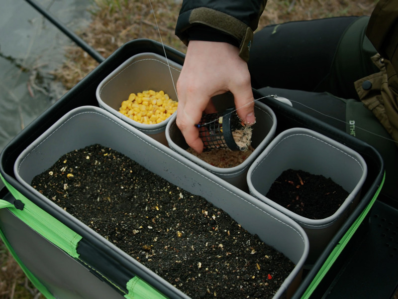 La partie principale est zippée, vous pouvez l'utiliser comme un sac de transport. C'est justement le couvercle qui joue un rôle essentiel dans la protection du contenu – il forme une barrière contre les rayons directs du soleil, empêchant ainsi le dessèchement des appâts et la dégradation des appâts vivants. Vos mélanges d'appâts auront ainsi une humidité optimale et un arôme appétissant tout au long de votre séjour.